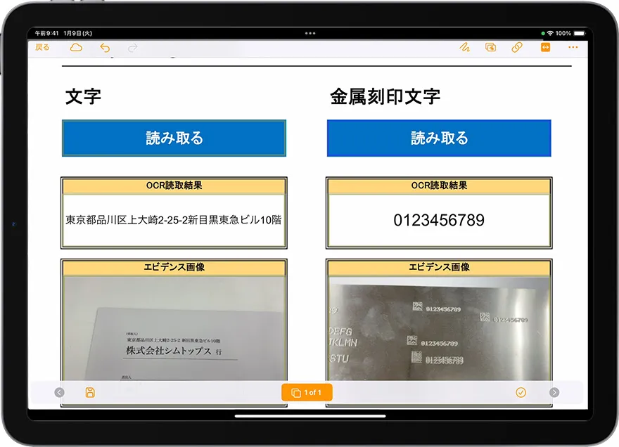 テキストデータと一緒にエビデンスとして画像を記録でき、出力先画像クラスターの解像度設定や撮影日時表示の設定が反映されます。品質管理や検査記録において、読み取った内容と実際の対象物の状態を同時に残すことができ、トレーサビリティの強化が可能です。 -